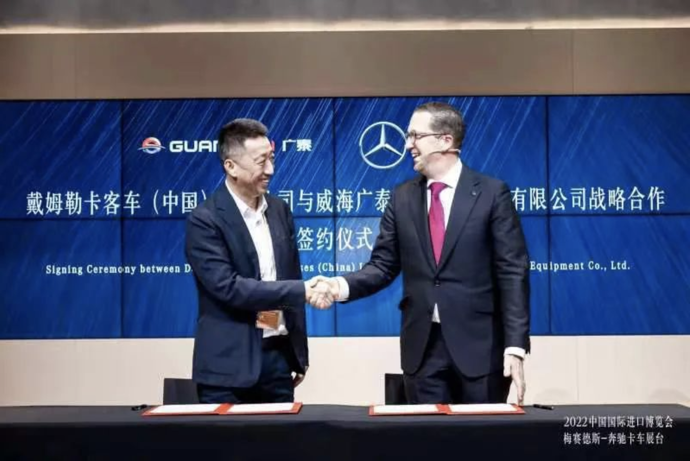 2022年11月5日,在第五届中国国际进口博览会现场,乐鱼网页版登录入口(以下简称“威海广泰”)董事长李文轩与戴姆勒卡客车(中国)有限公司(以下简称“戴姆勒卡客车(中国)”)首席执行官秦坦签订了《战略合作框架协议》。双方在之前良好合作的基础上,正式建立战略合…