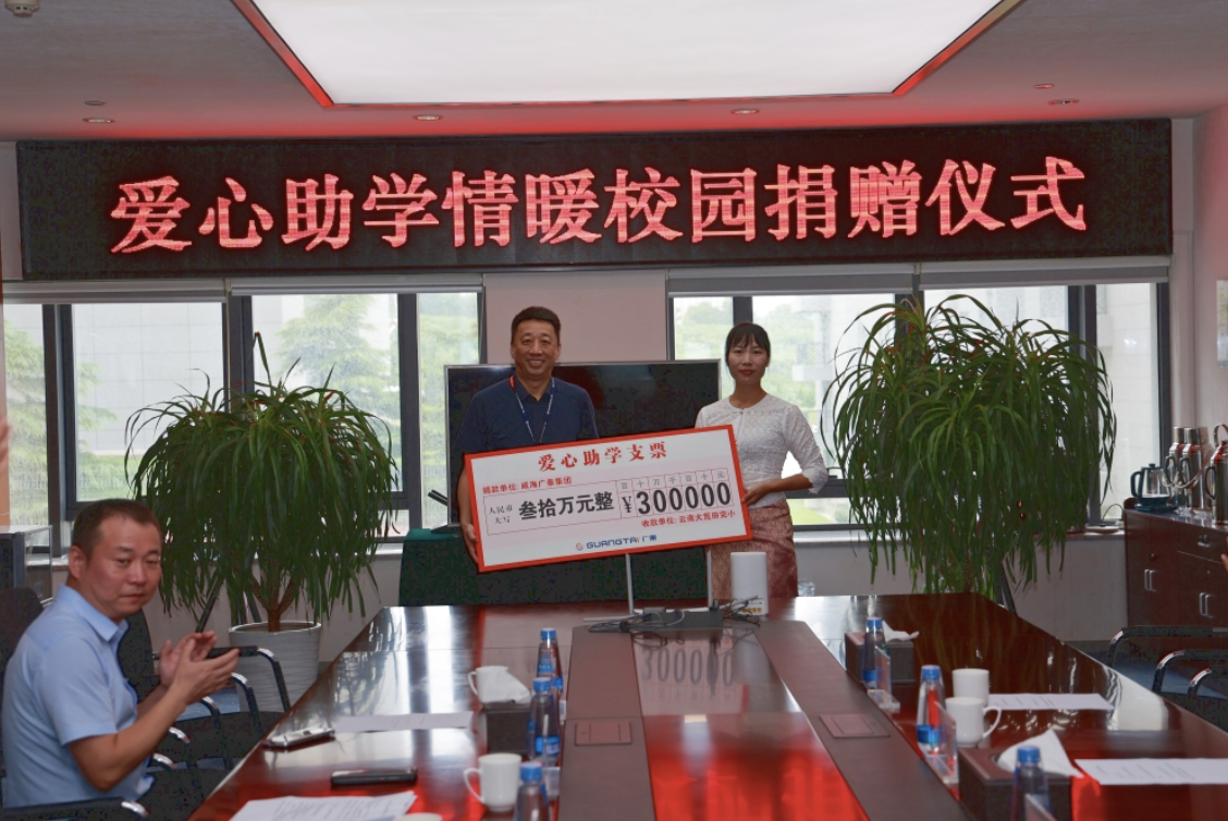 近日,云南大荒田驻村第一书记赵伟率云南大荒田完小校长李梅一行11人来访威海广泰,李文轩董事长一行热情接待并在大厦三楼会议室进行了“爱心助学情暖校园”捐赠仪式。李文轩董事长代表广泰公司向云南大荒田完小捐赠30万元助学基金,并代表全体广泰员工将6月1日捐赠的4000册爱心图书…