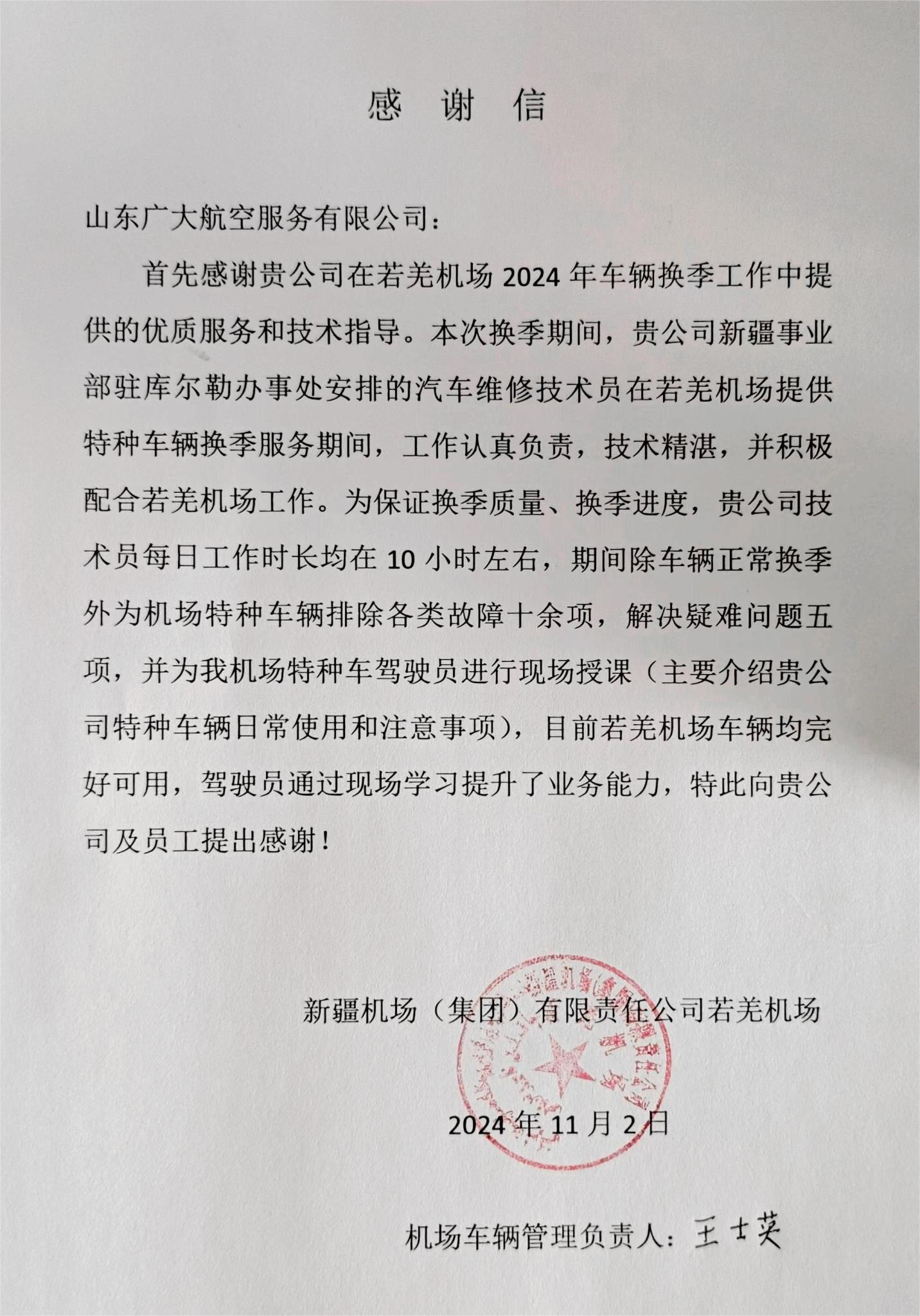 近日,新疆机场(集团)有限责任公司若羌机场向山东广大航空服务有限公司(以下简称“广大航服”)致感谢信,对其在2024年车辆换季工作中提供的优质服务和技术指导表示诚挚的感谢。若羌机场在感谢信中提到,广大航服的汽车维修技术员在换季期间表现出色,以专业技能和敬业精神为若羌…