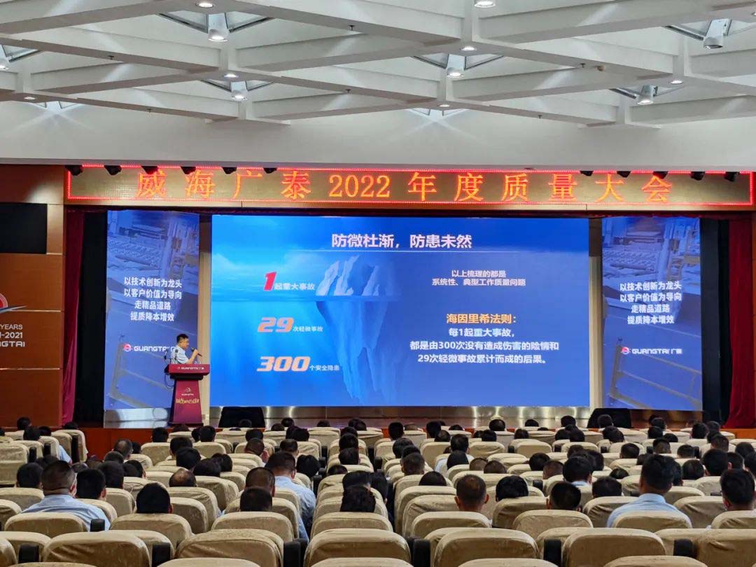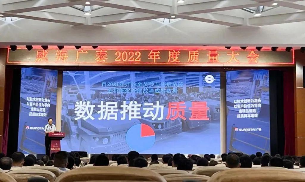 下午13:30,在广泰研发大楼礼堂,威海广泰召开以“数据推动质量创新 全面参与持续创新”为主题的2022年度质量大会,李文轩董事长出席会议,公司副总经理尚羽主持会议,各分子公司同步线上参会。
