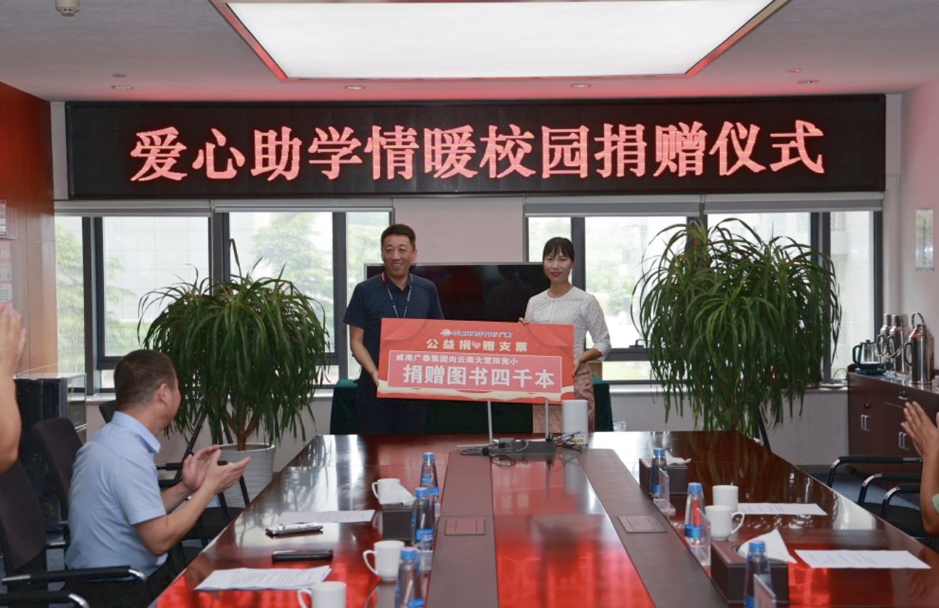 近日,云南大荒田驻村第一书记赵伟率云南大荒田完小校长李梅一行11人来访威海广泰,李文轩董事长一行热情接待并在大厦三楼会议室进行了“爱心助学·情暖校园”捐赠仪式。李文轩董事长代表广泰公司向云南大荒田完小捐赠30万元助学基金,并代表全体广泰员工将6月1日捐赠的4000册爱心图书一起转交给李梅校长。