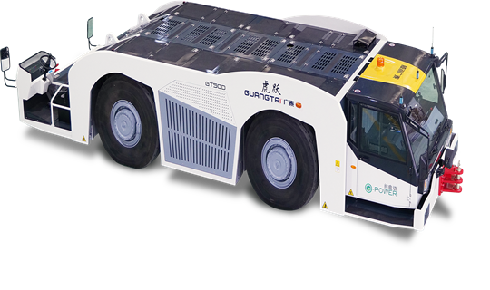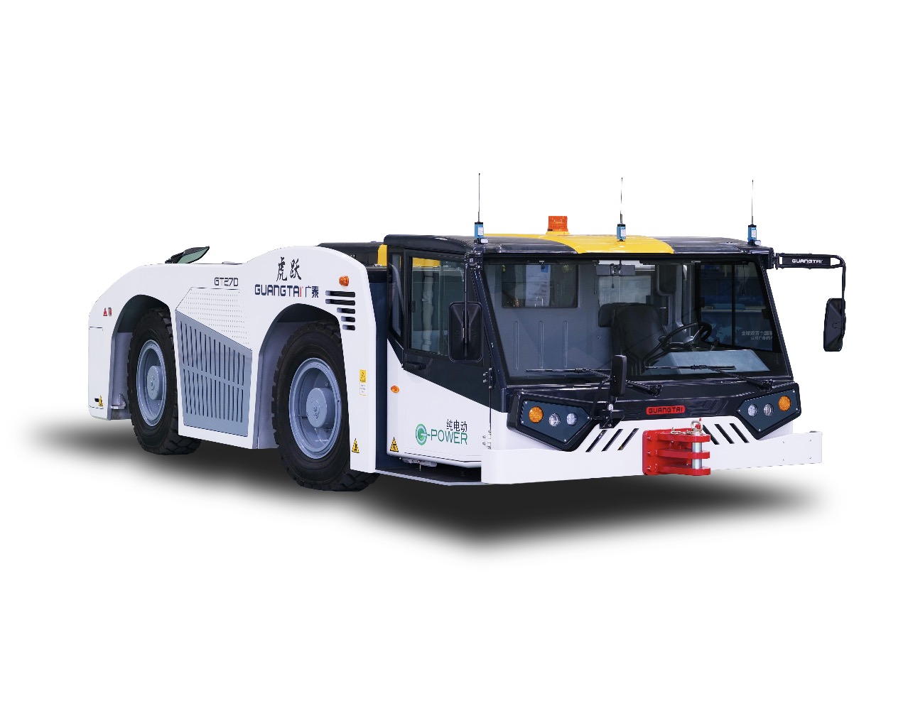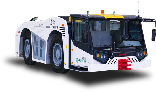 该类设备以纯电能为动力,是牵引和顶推飞机离开机场停机廊桥的地面保障设备,同时还可因飞机故障及维护需要,用于救援、牵引和移动飞机至维修机库。该设备主要由底盘、电动机、电池、变速箱、传动轴、前后桥、轮胎总成、制动系统、转向系统、驾驶室、控制系统等组成。