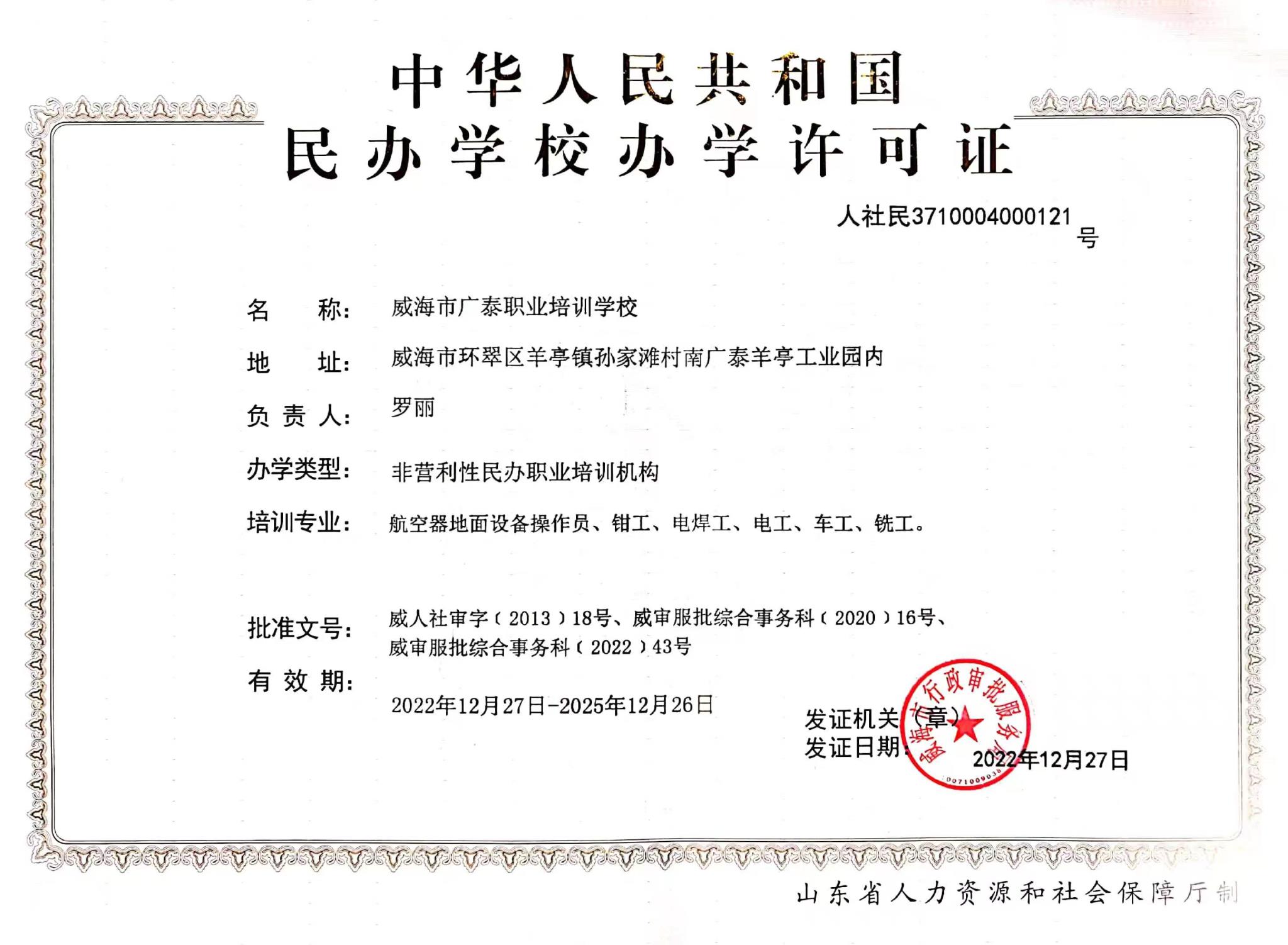 威海广泰职业培训学校成立于2013年,由乐鱼网页版登录入口全资设立。 学校位于威海市环翠区羊亭镇惠河路93号,是经威海市人力资源和社会保障局批准成立的职业培训机构,具有民航特种车辆操作工、民航特种车辆机械维修工、民航特种车辆电气维修工、钳工、电工、焊工、车工、铣工、涂装工、计算机操作员等工种的初、中、高级职业技能培训资质。学校致力于成为民航业内专业的技能提升培训服务机构,坚持“教练结合、寓教于练”的培训理念,为学员提供优质的培训服务。